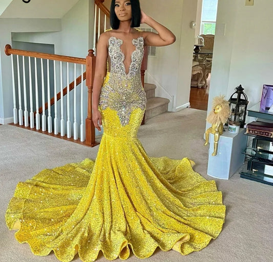 Sparkly Yellow Mermaid Prom Dress 2024 Beads Crystal Rhinestones Graduation Party Dress Birthday Wedding Reception Robe De Bal