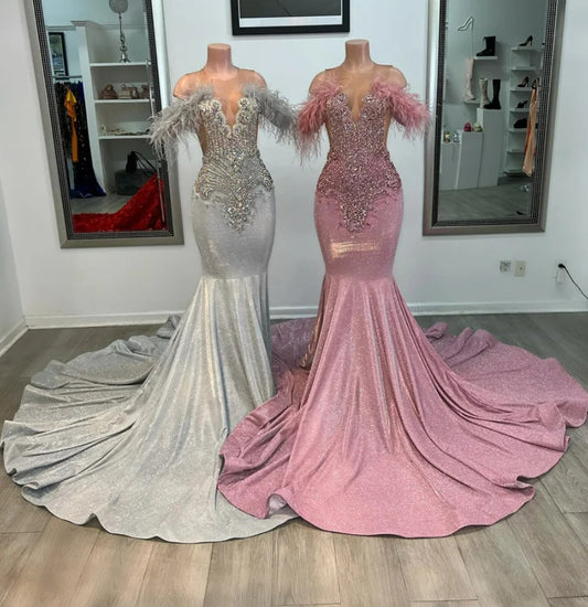 Sparkly Diamonds Long Prom Dresses For Black Girls Crystal Beading Rhinestones Feathers Birthday Party Dress Wedding Reception