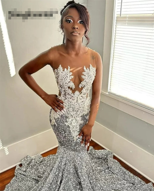 Sexy Glitter Silver Diamonds Prom Dresses Sheer Neck Crystal Beads Sequins Party Gown Wedding Evening Gowns Robe Court Train