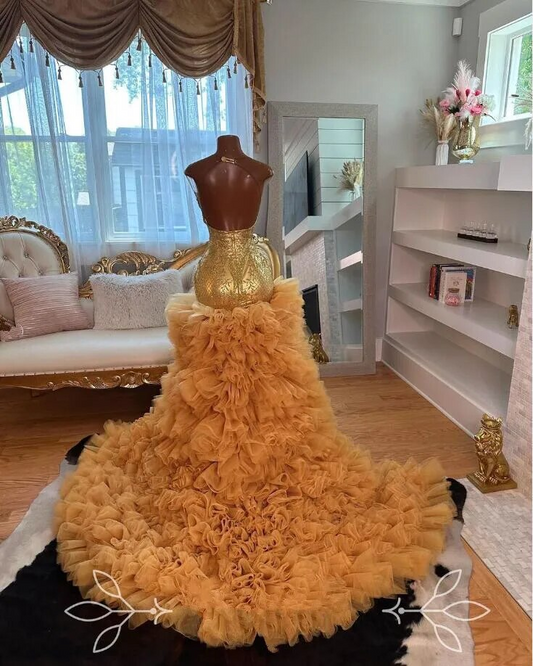 Gold High Low Black Girl Prom Dress for Women Sparkly Diamond Crystal Ruffles Skirt Mermaid Wedding Party Gown