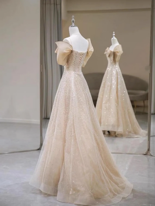 Champagne Sequin Tulle Sequin,Sweep Train Gown,Evening Gowns,Bridesmaid Dress,Wedding Dress,Off Shoulder Lace Formal Long Dress,Design Fee