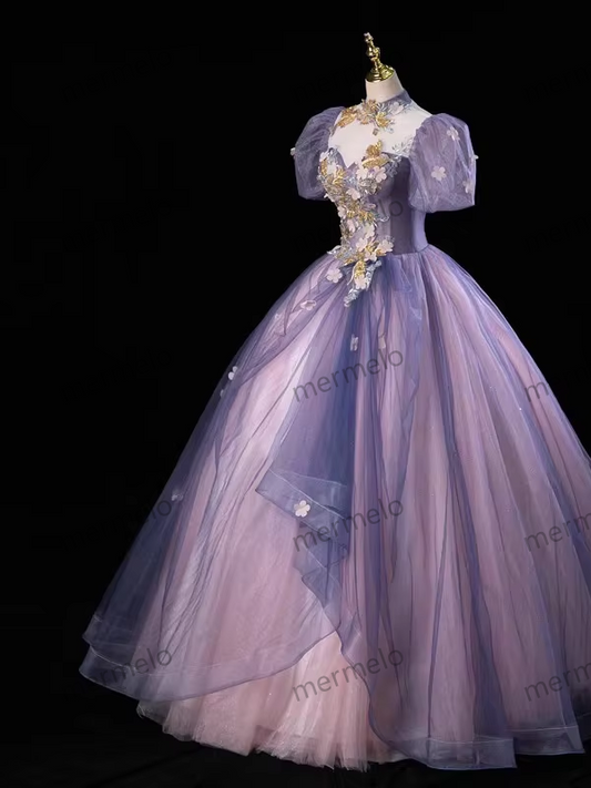 Women's Elegant Long Evening Dress Purple Tulle Half High Collar Appliques Puff Sleeves Wedding Birthday Party Formal Prom Gown