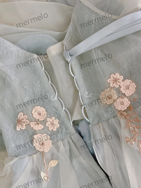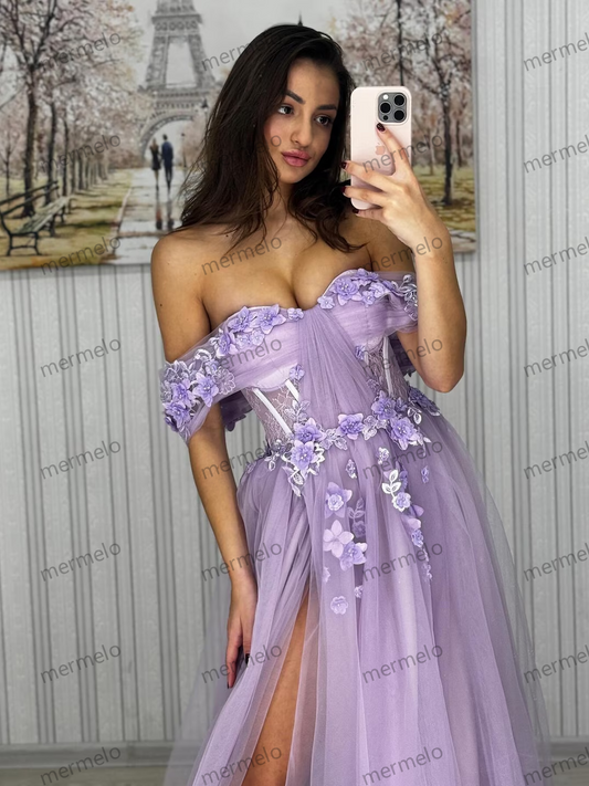 Lavender Off-Shoulder Evening Gown with Floral Appliqué and Thigh-High Slit, Elegant Tulle A-Line Prom Dress, bridesmaid or graduation dress