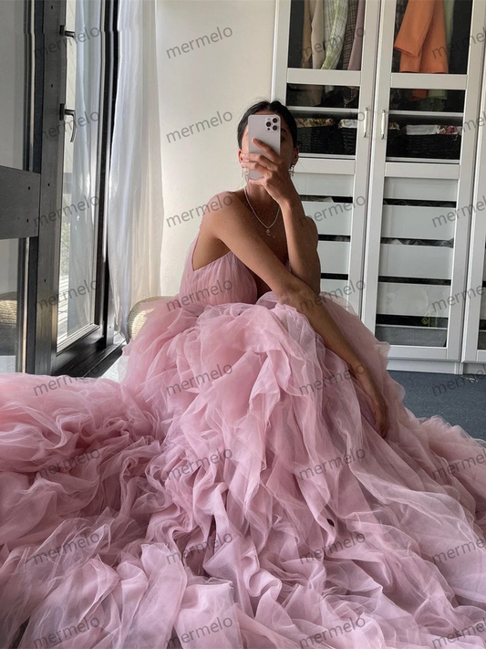 Pink Tulle Dress with Ruffles, Corset Prom Dress with Spaghetti Straps, Homecoming Dress, Princess Bridal Shower Dress
