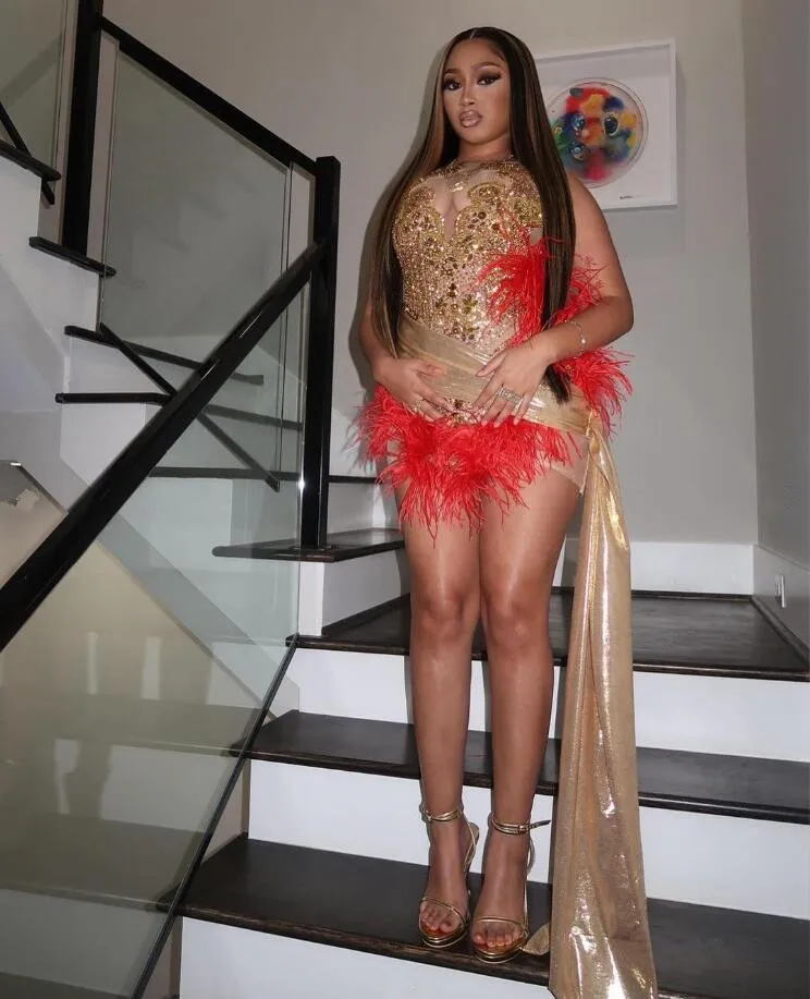 Luxury Mini Evening Cocktail Dress Diamond Crystal Feather Black Girl Birthday Queen Gown