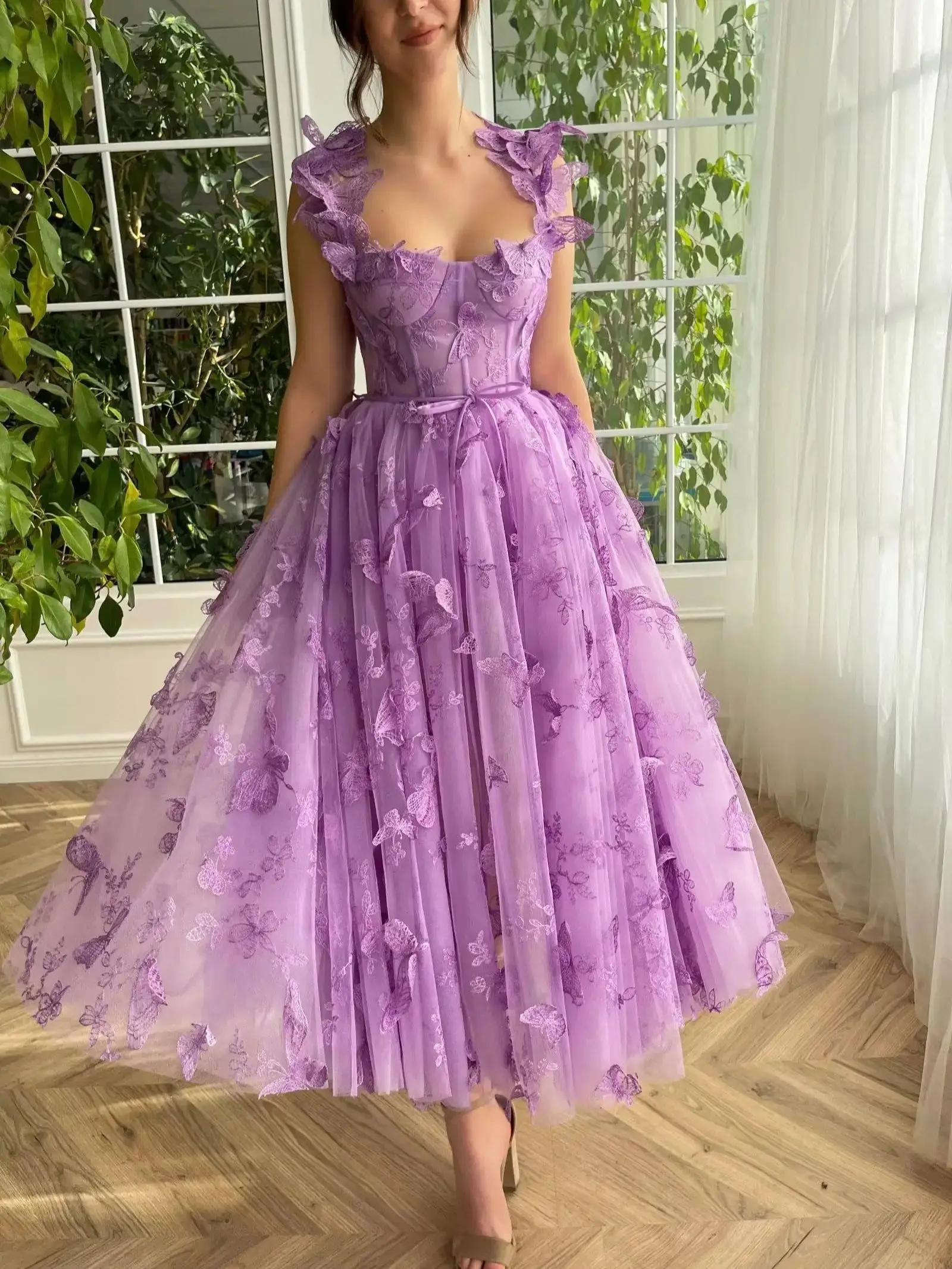Tulle Prom Dresses 3D Butterfly Spaghetti Straps Tea Length Homecoming Dress