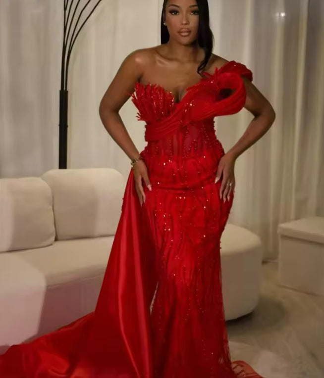 2025 Aso Ebi Red Off Shoulder Evening Dresses Slit Train Beaded Cocktail Dress Dubai Girls Party Gown Robes De Soiree Customized