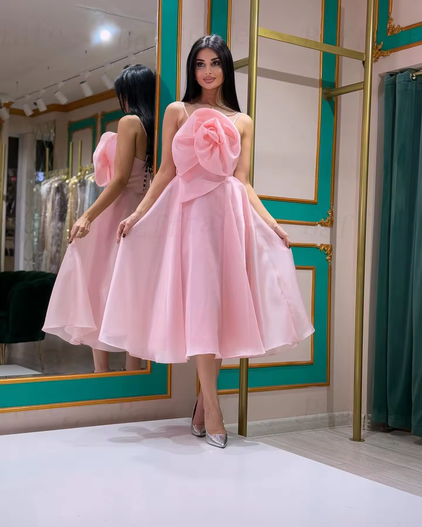 A Line Pink Organza Midi Prom Dresses Corset Flower Formal Party Bridesmaid Gowns Women Special Occasion Evening Dress