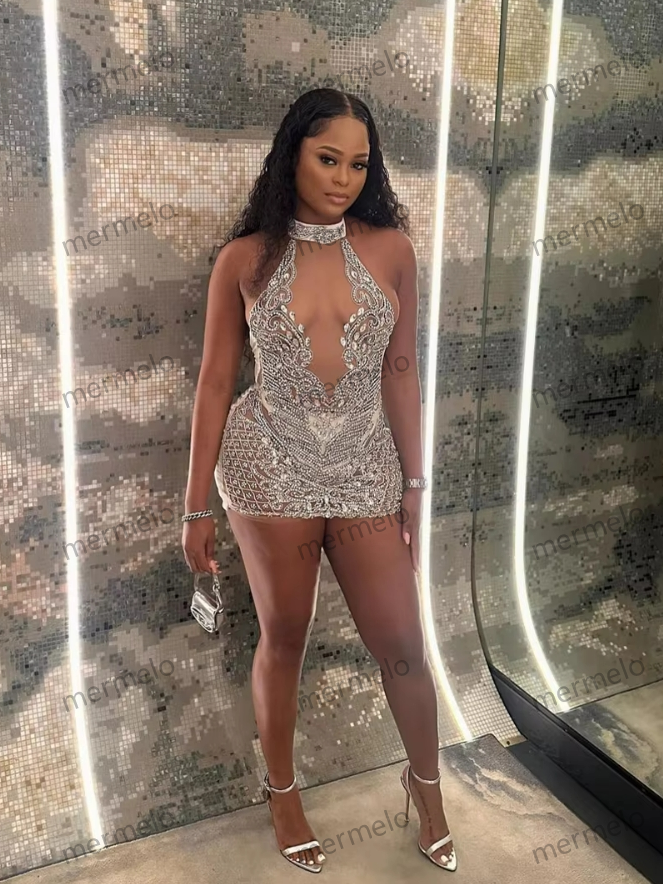 Birthday Luxury Dress Silver Rhinestoneds Crystal Halter Mini Prom Dress