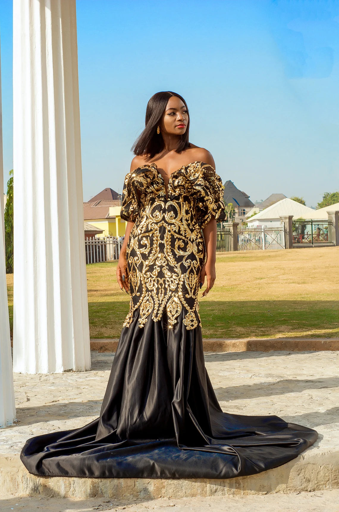 Black & Gold Evening Gown with Mermaid Train, Gold Dresses for Events, Elegant Off-Shoulder Black and Gold Mermaid Dress