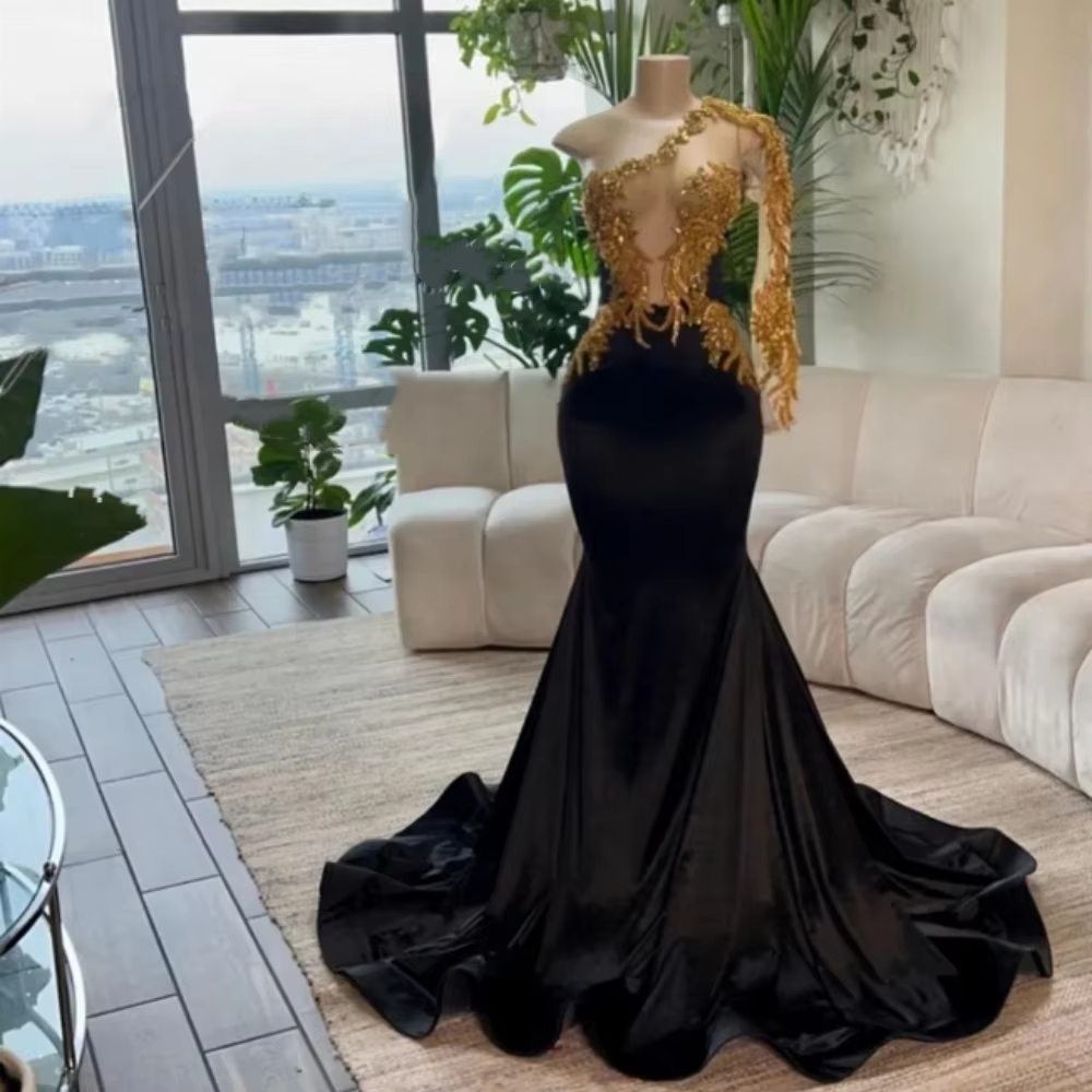 Black Mermaid Evening Dresses Sparkly Gold Sequined Lace Formal Party Gowns One Shoulder Long Sleeve Special Occasion Prom Dress