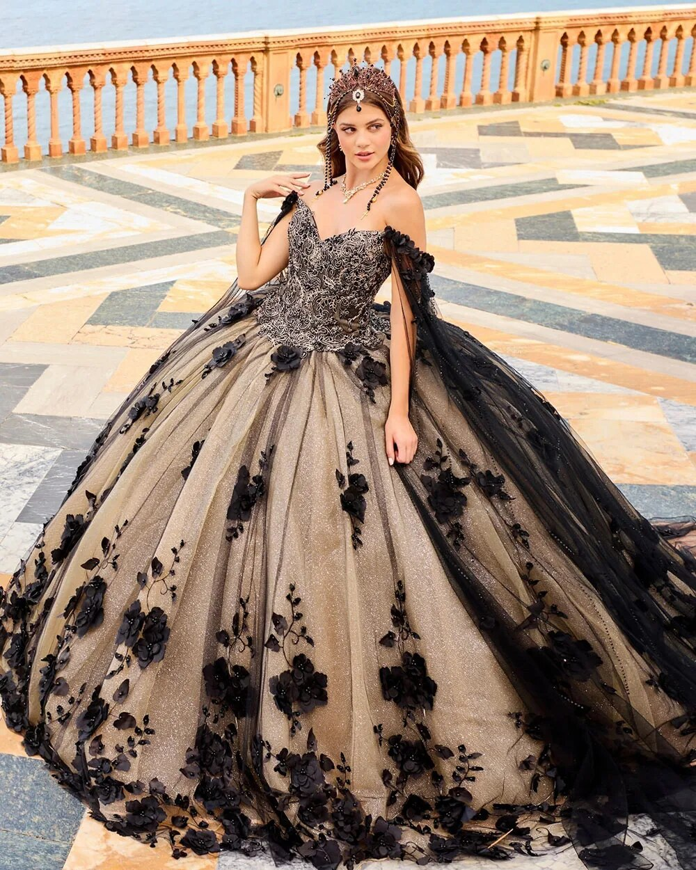 Black Quinceanera Dresses Ball Gown Floral Applique Off Shoulder Sweet 16 Dresses Birthday Prom Party Vestidos De 15 Años
