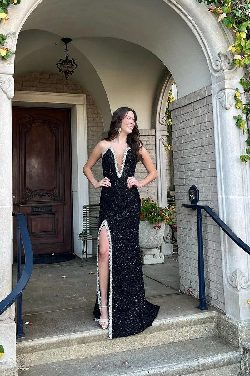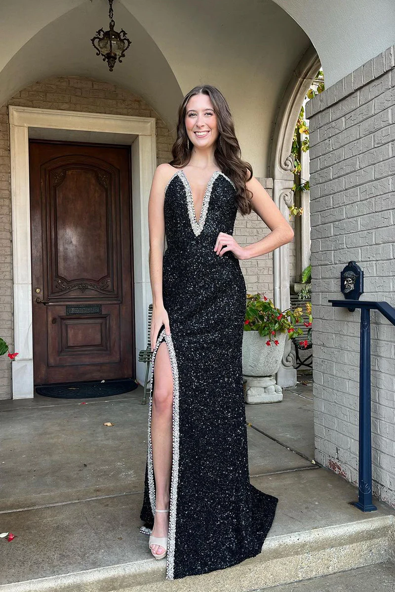 Black V Neck Sequin Mermaid Long Prom Dresses with Beads