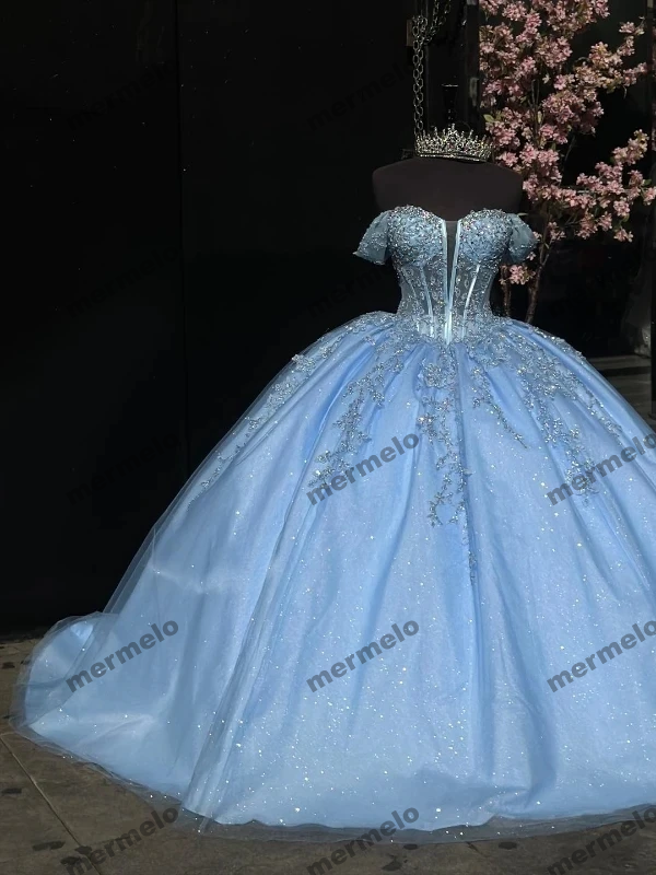 Blue Quinceanera Dresses Off-Shoulder Shiny Lace Beading Vestidos De 15 Anos Birthday Party Princess