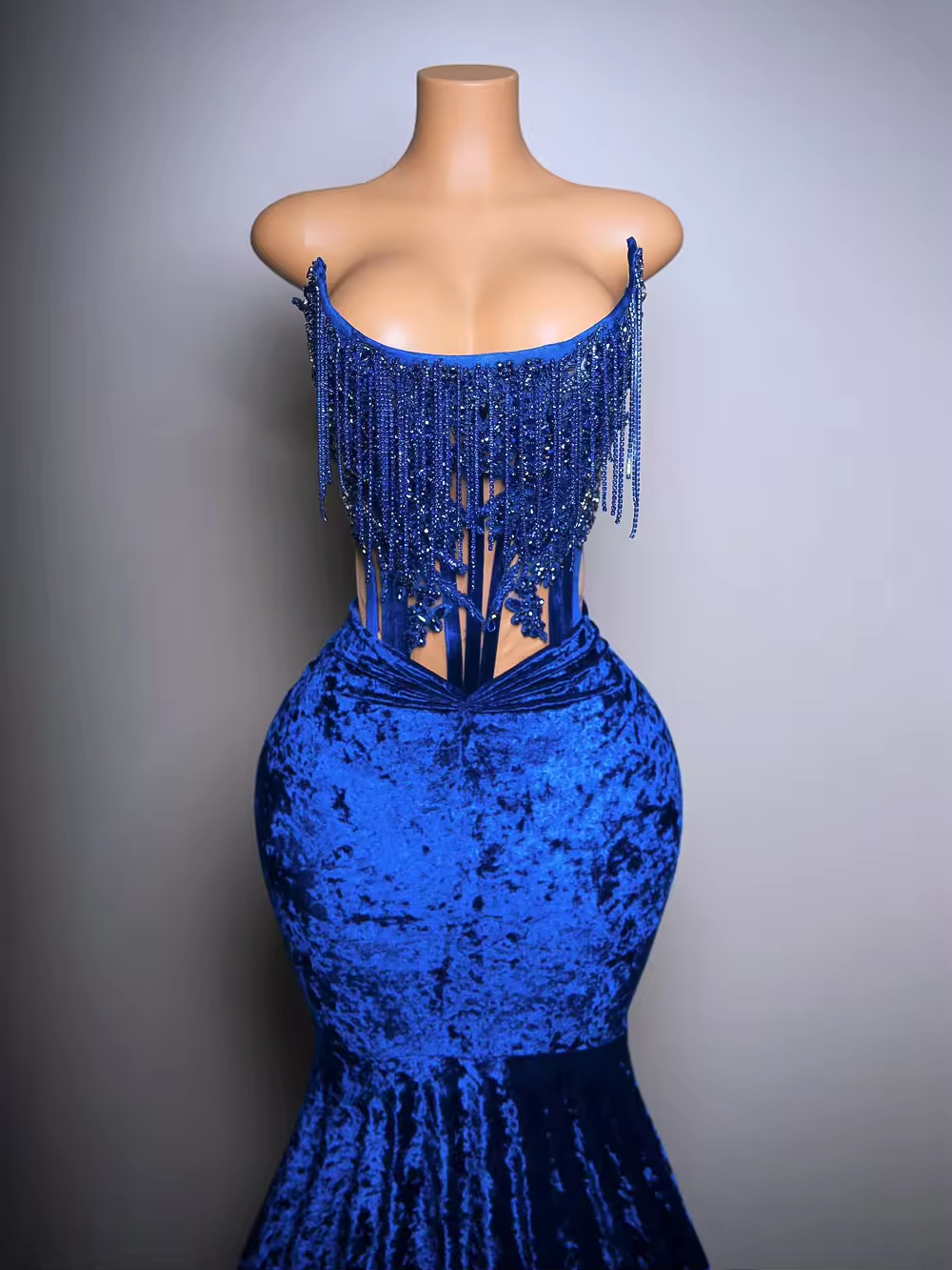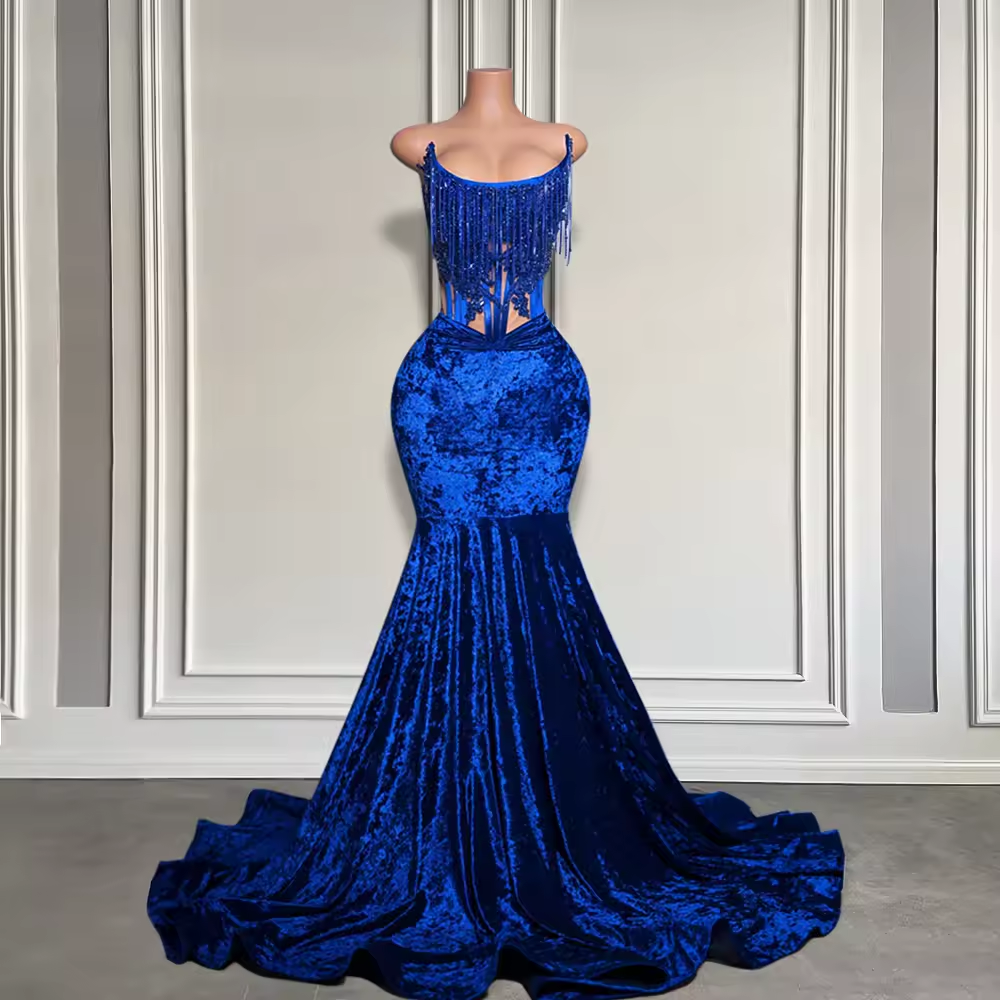 Blue Velvet Long Mermaid Prom Dresses for Black Girls Sexy Boning Lace-up Corset Strapless Formal Party Gala Gown Customized