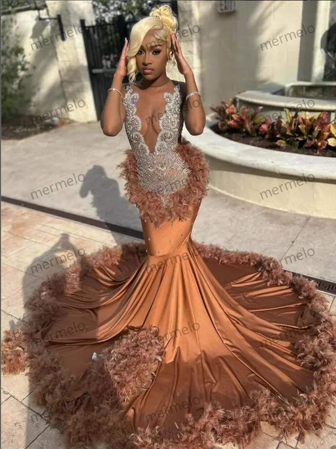 Brown Long Mermaid Evening Birthday Gala Dresses for Black Girl Luxury Diamond Crystal Feather Prom Ceremony Party Dress