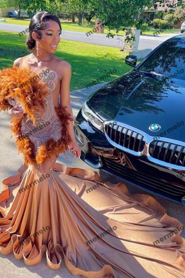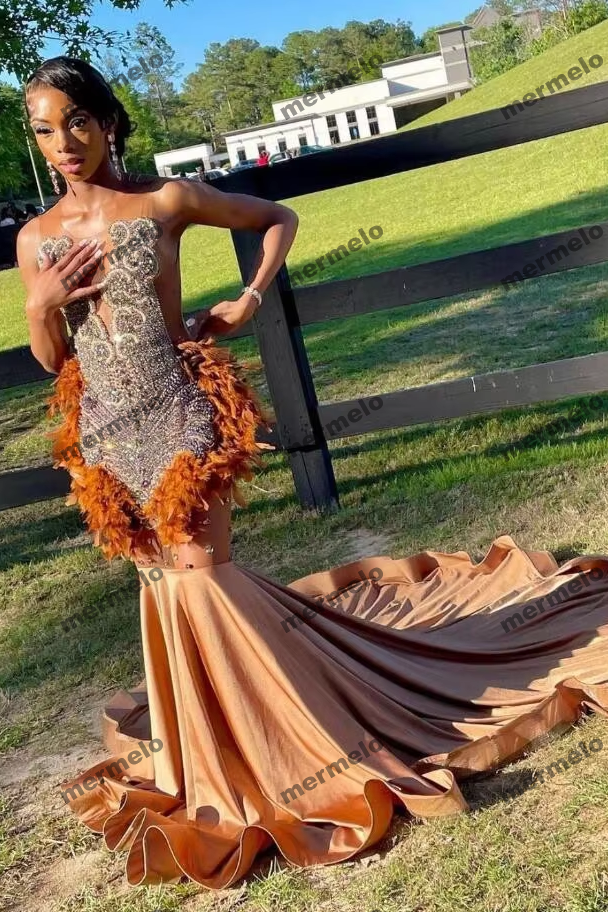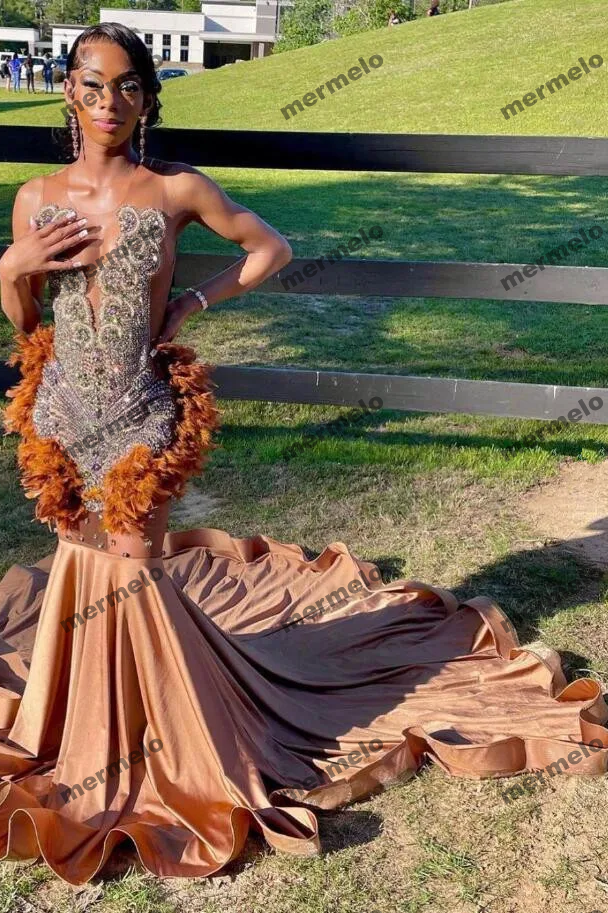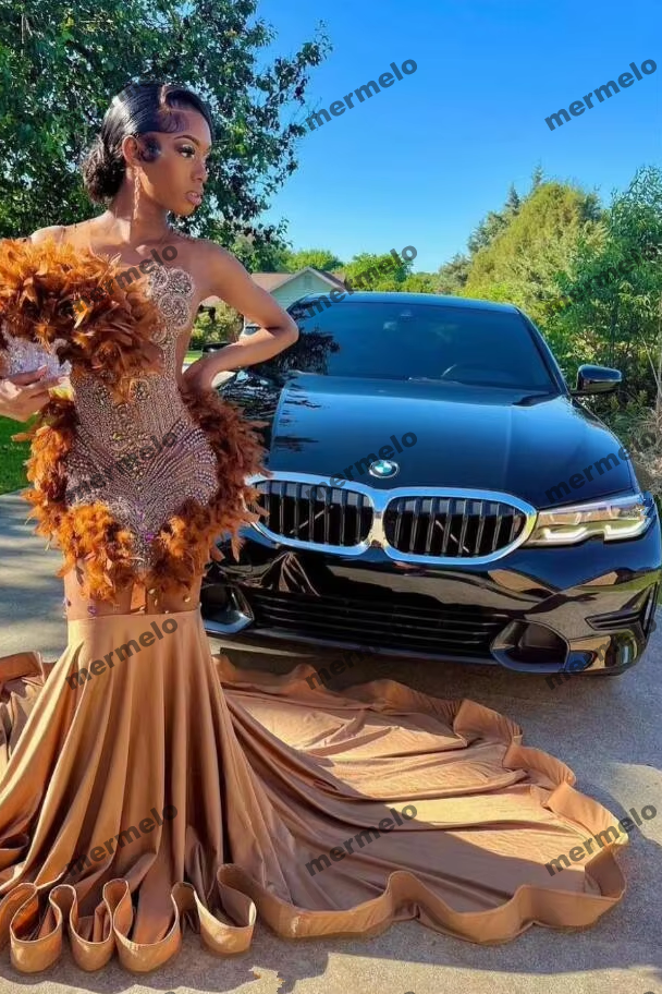 Brown Ostrich Feathered Short Prom Dress for Black Girl Luxury Diamond Crystal African Birthday Homecoming Gown
