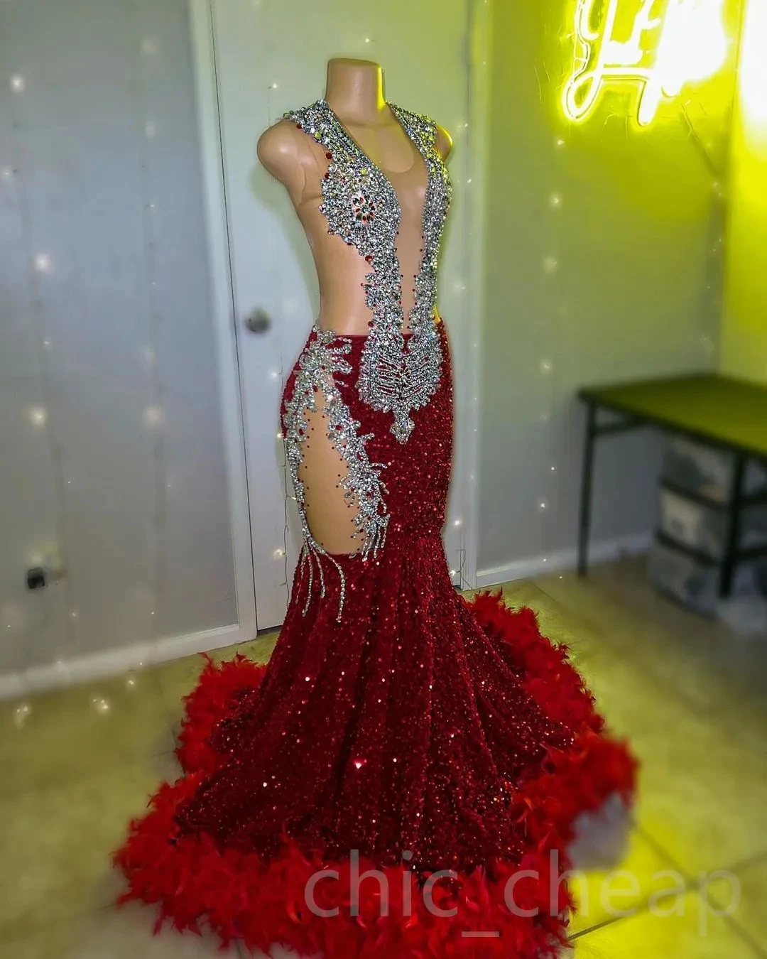 Burgundy African American Prom Dresses Mermaid Sheer Sequins Beaded Crystals Feather Black Girls Nigeria Evening Dresses Gown
