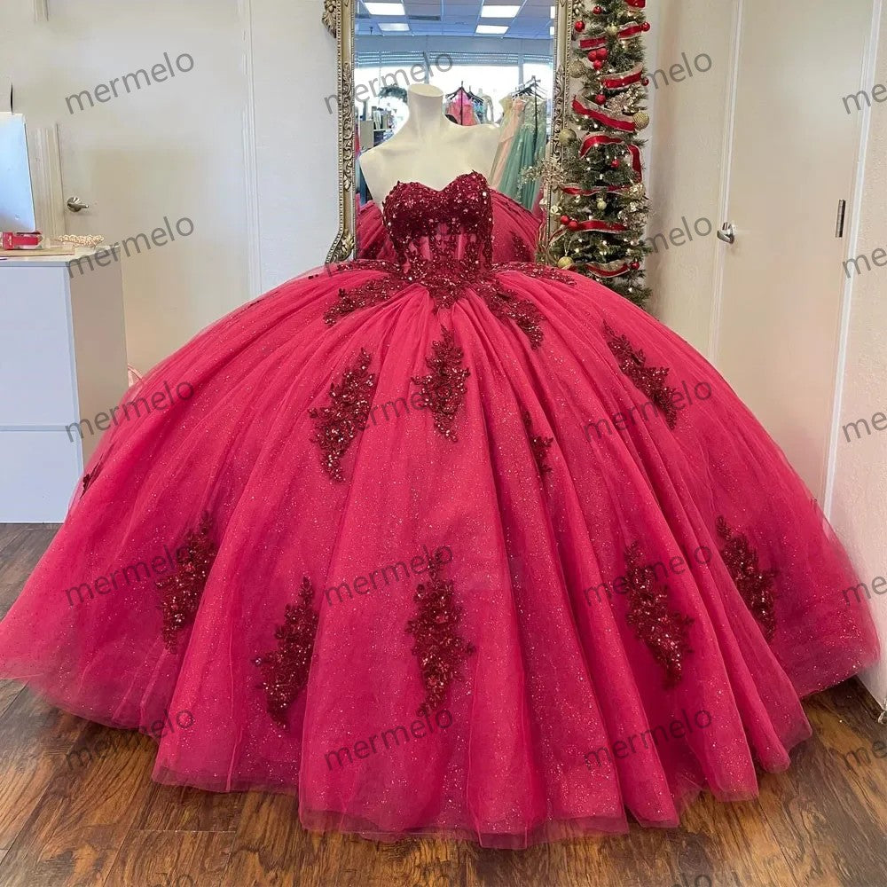 Burgundy Quinceanera Dresses Sweetheart Ball Gown Crystal Lace Appliques