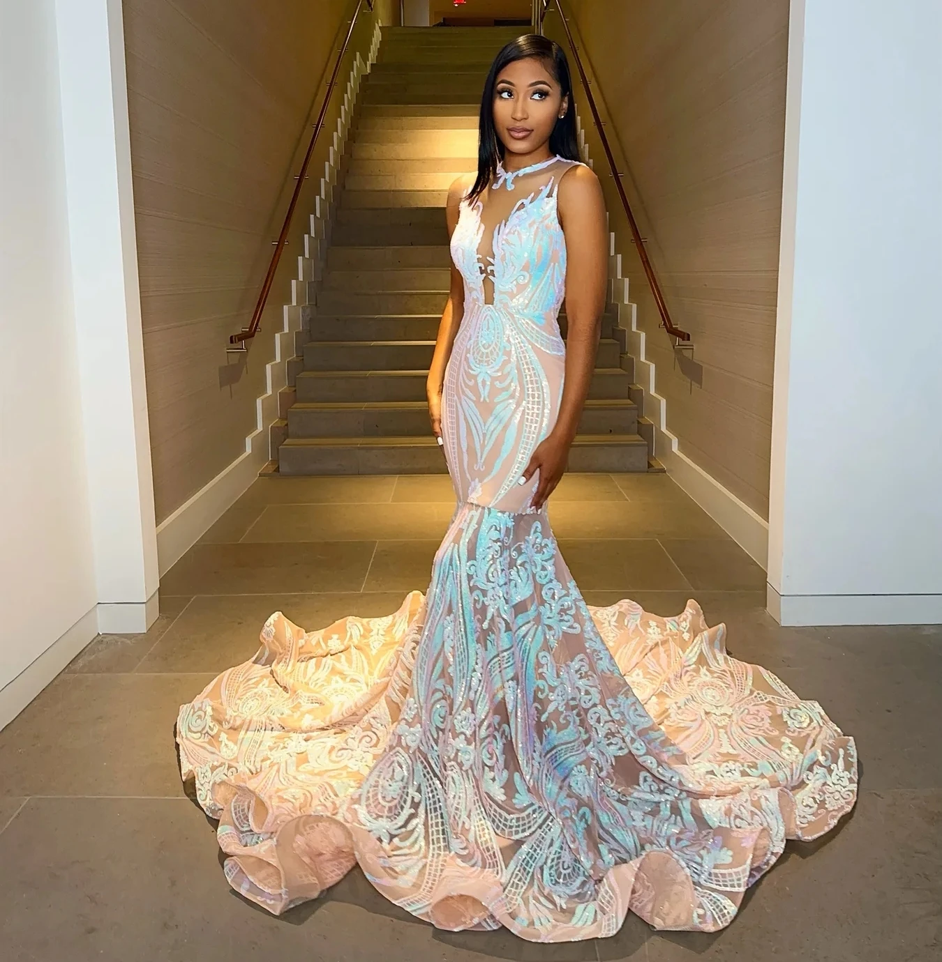 Champagne Sheer Women Long Black Girls Prom Dresses Mermaid Sequins Lace Prom Gowns Evening Gala Party