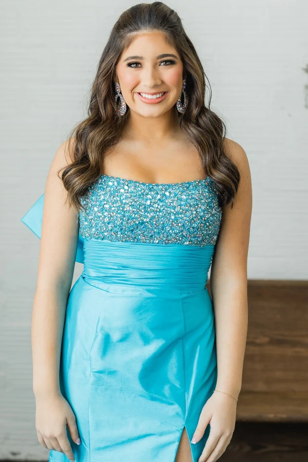 Indulge in luxury with our evening gown. This chic and modern sheath dress features a strapless, sleeveless design adorned with beaded sequins and pleated details. The high side slit and train add a touch of drama, while the bow knot gives a sophisticated finish. Perfect for your next formal event.