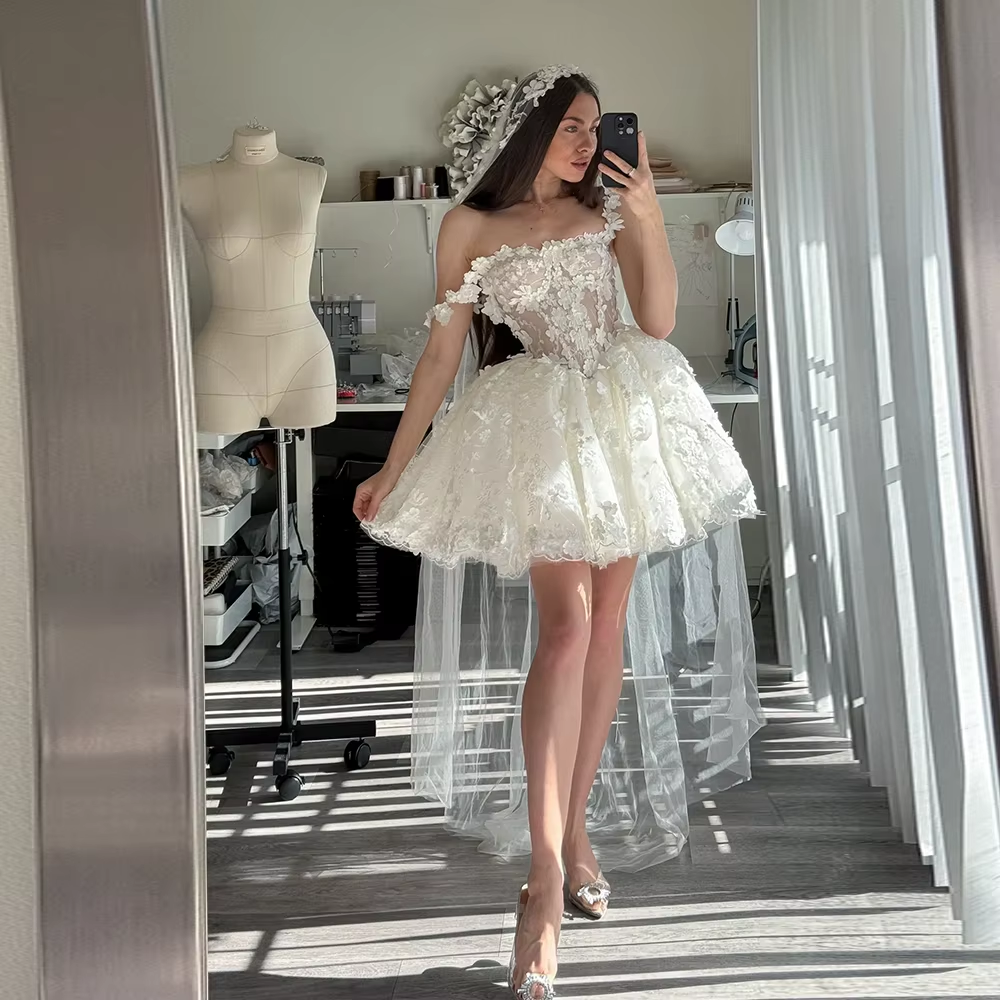 Chic Short Mini 3D Floral Applique Lace Tull Weeding Party Dress A-line Lace up Wedding Bridal Gown for Women Vestido De Novia