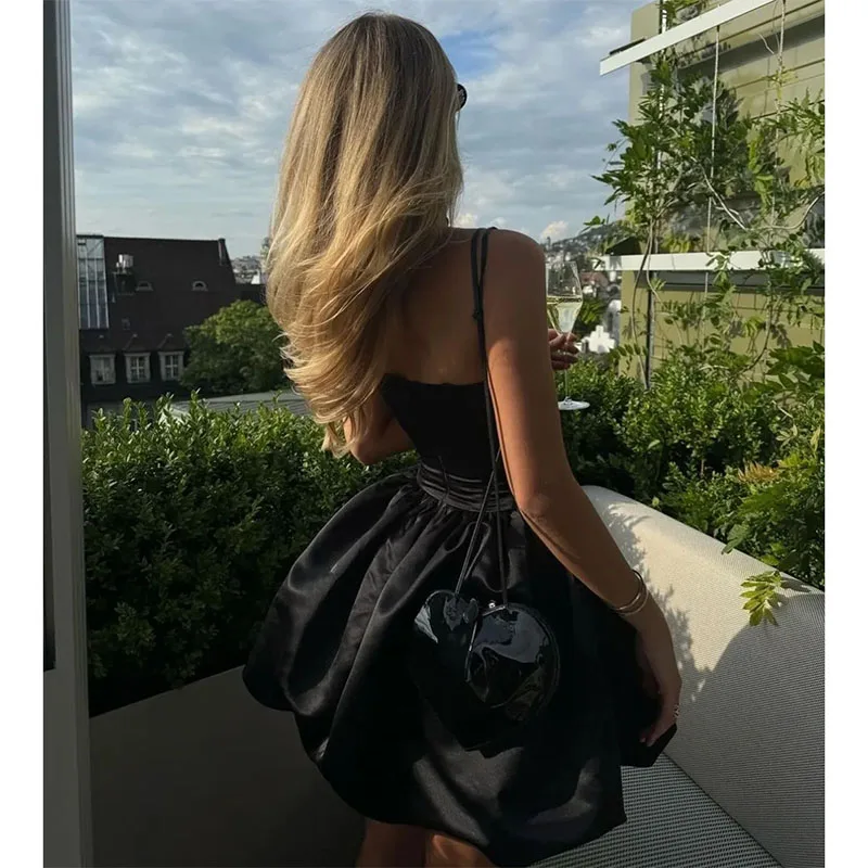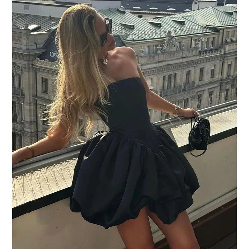 Classy Short Black Sating Evening Dresses A-Line Strapless Mini Length Pleated Formal Occasion Prom Party Gowns