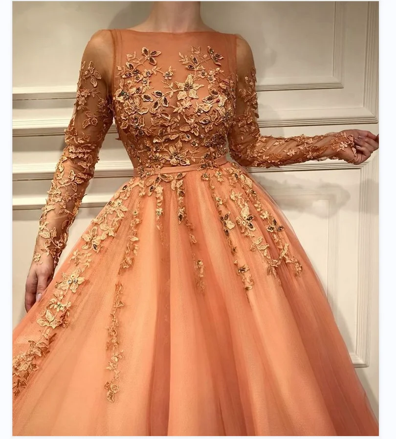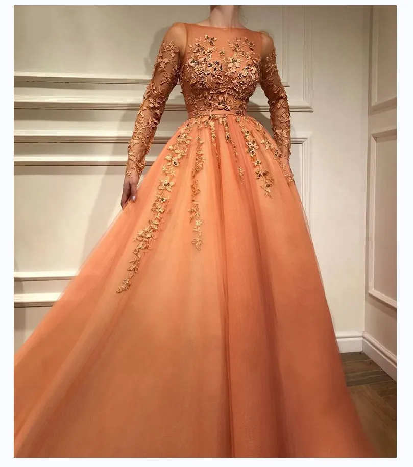 Custom Orange Long Sleeve 3D Flowers Appliques Floor-Length A-Line Tulle Sweep Train Formal Evening Dress