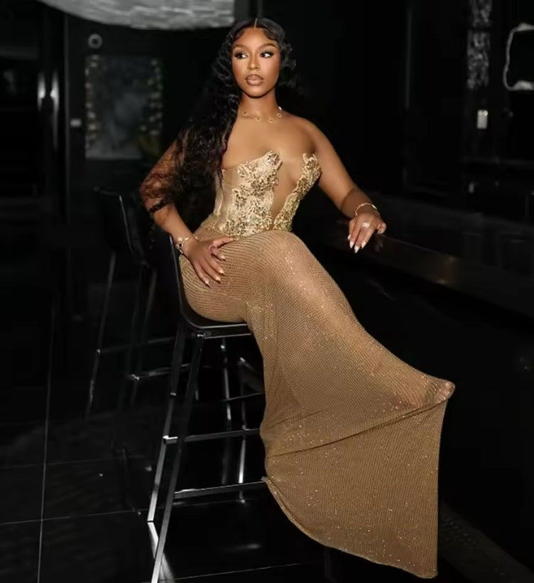 Customized Gold Evening Dress Crystals Beading Crystal Prom Gowns Bridal Wedding Party Dress Vestidos De Novia