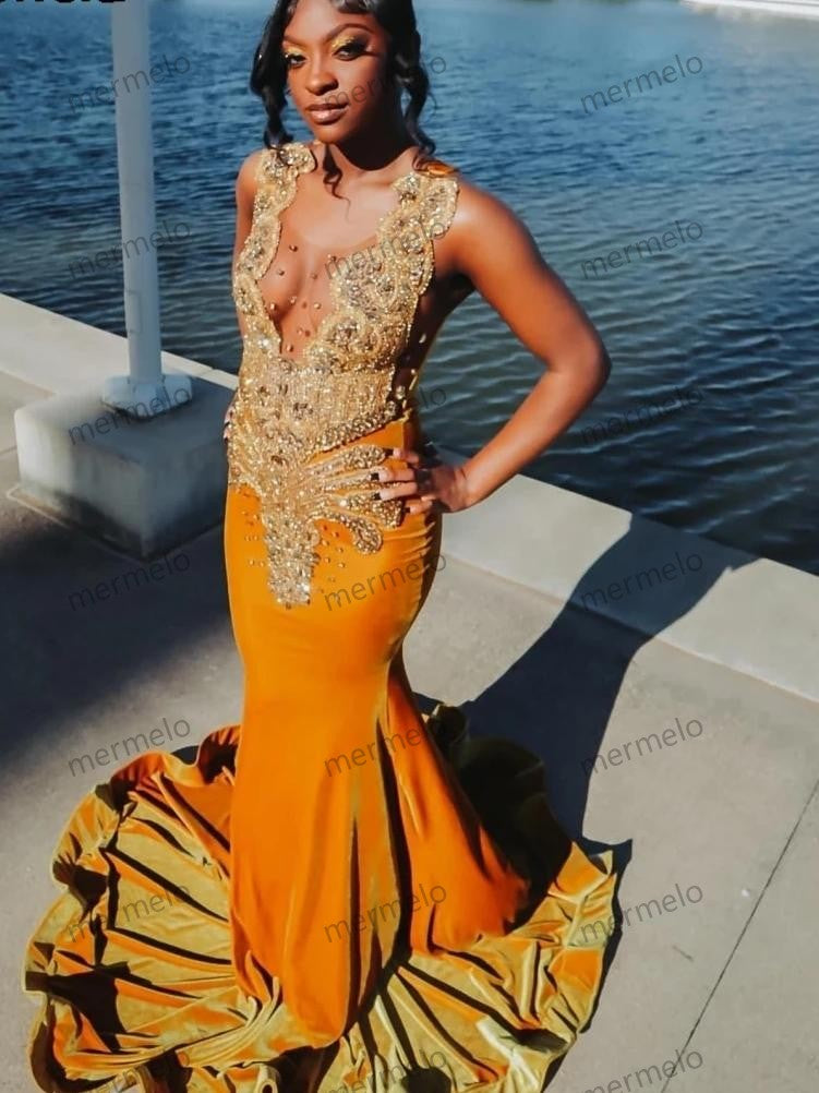 Customized Orange Velvet Diamonds Prom Dress For Black Girls Gold Crystal Rhinestone Beaded Party Gala Gowns