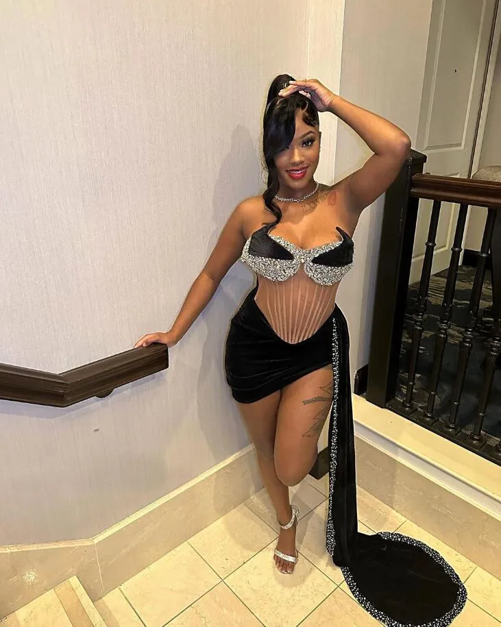 Cute Velvet Diamond Mini Evening Cocktail Dress with Side Train Crystal Boning Bustle Black Girl Birthday Prom Gown 2024