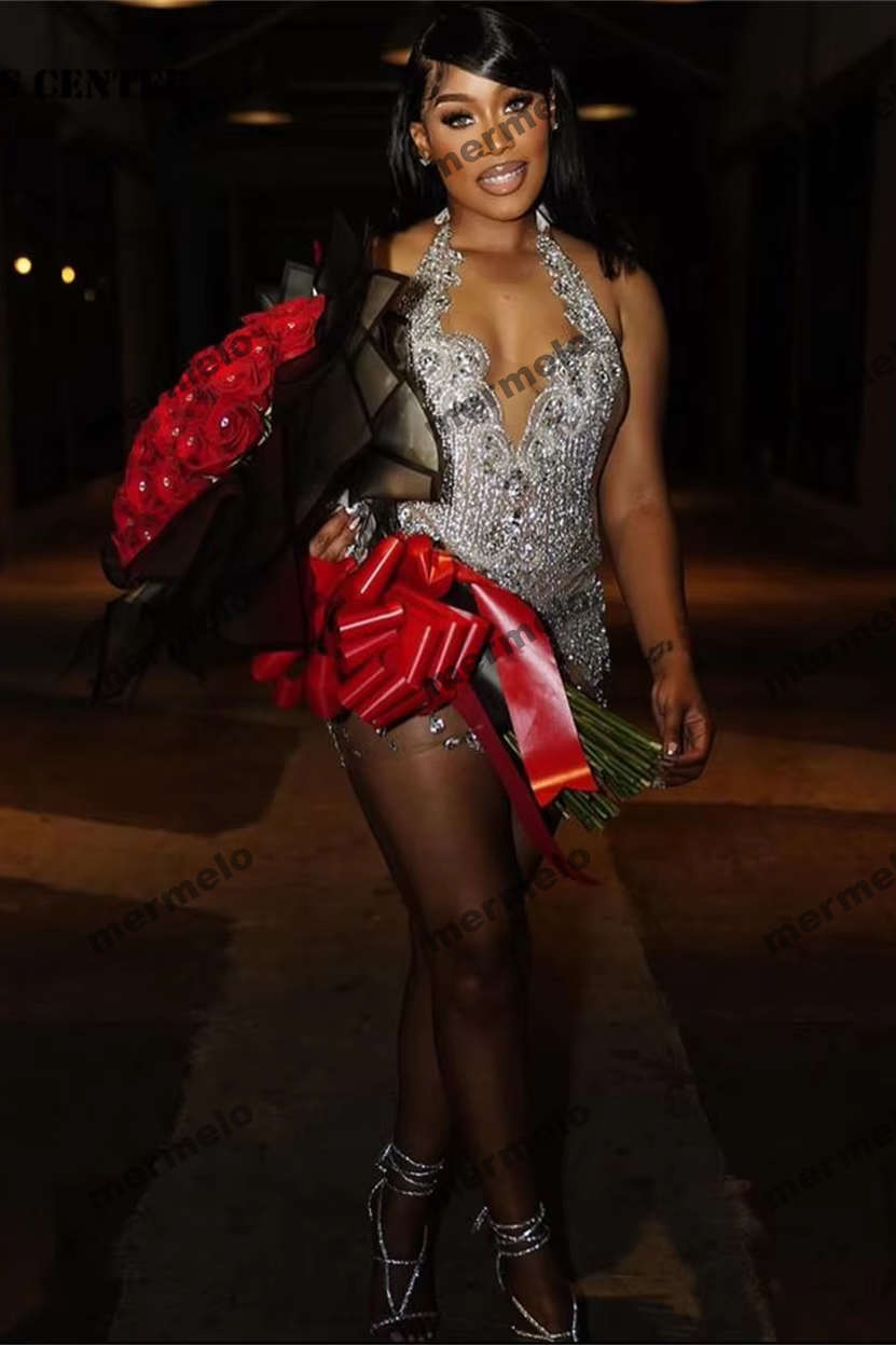 Sliver Crystal Beaded Prom Dress Mini Cocktail