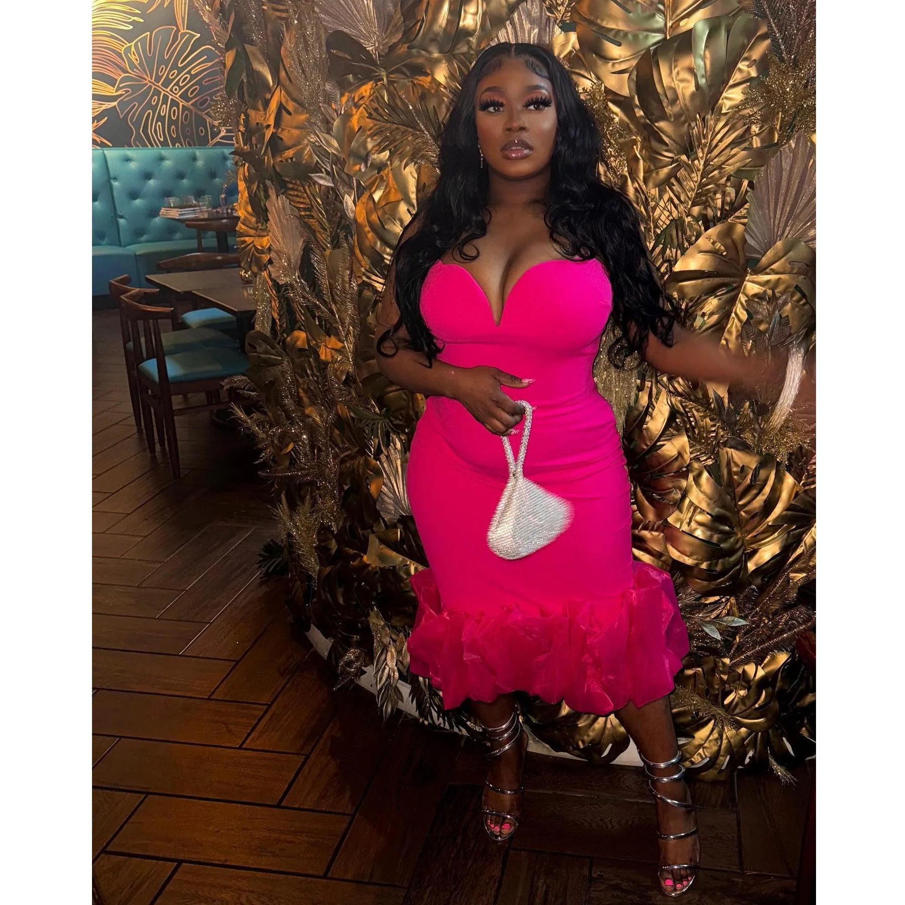 Eey Catching Fuchsai African Women Dresses To Party Organza Ruffles Bottm Sexy Strapless Mid Calf Aso Ebi Women Dress