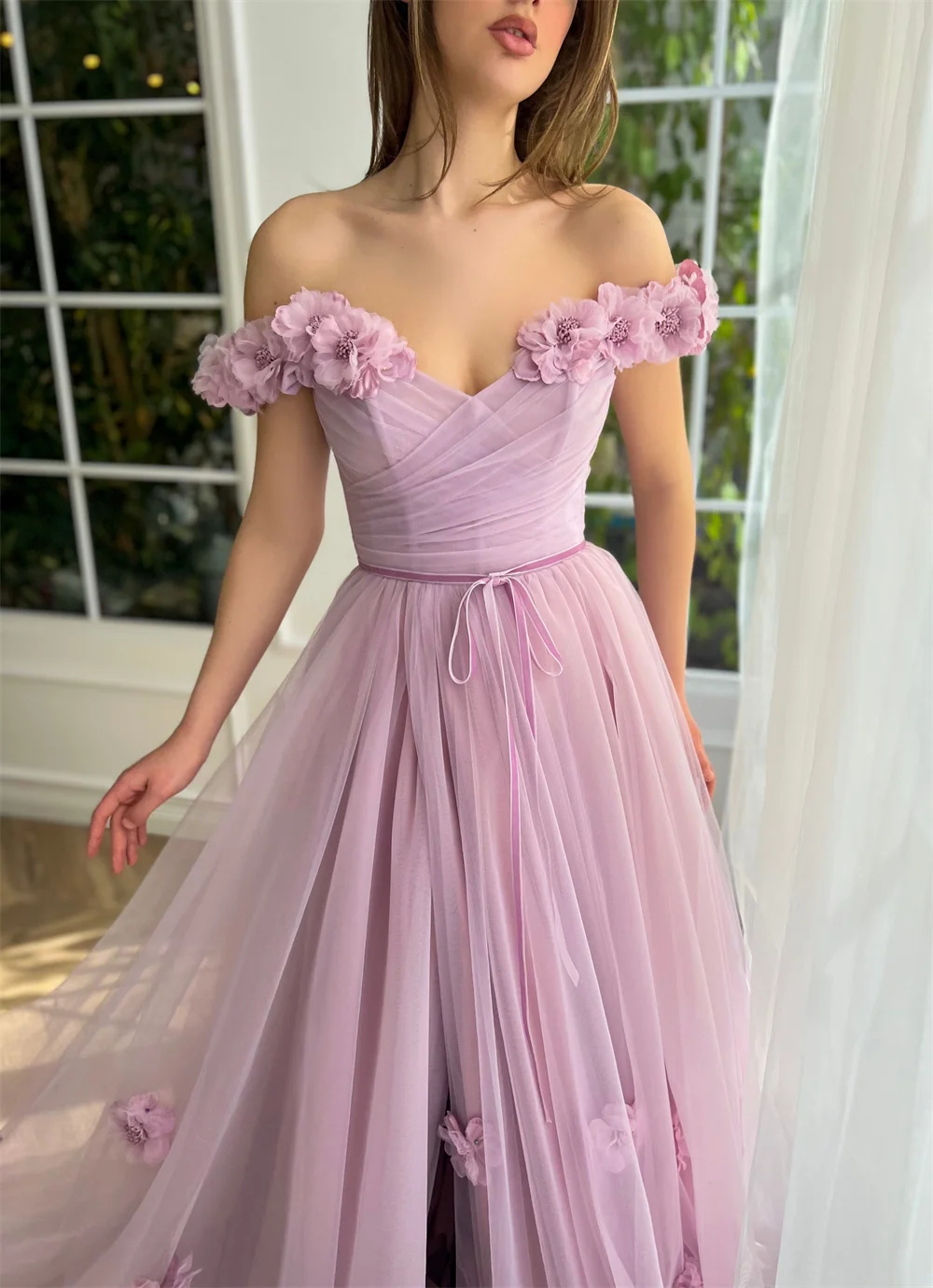 Elegant 3D Flower Dress Princess A-line Evening Dresses Sweet Side Split Vestidos De Noche Tulle Train Prom Dress