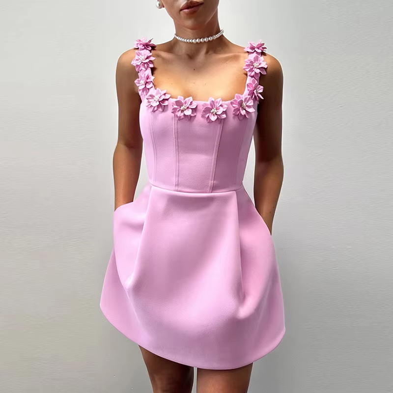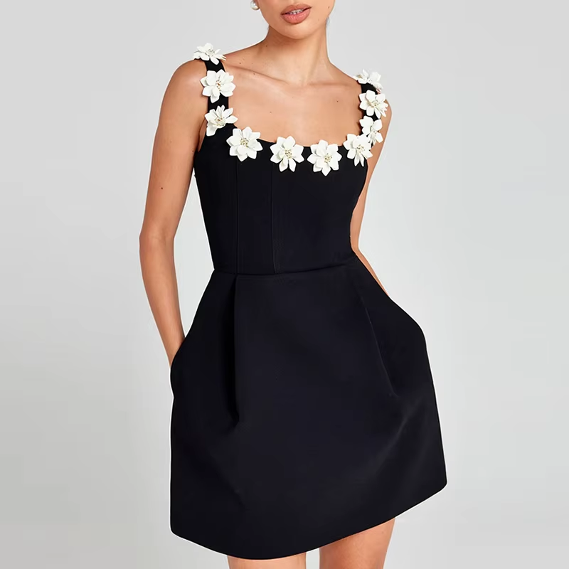 Elegant Floral Edge Suspender Mini Dress Fashion Sleeveless Backless Pocket Dress Banquet Lady Solid Nipped Waisted Party Dress