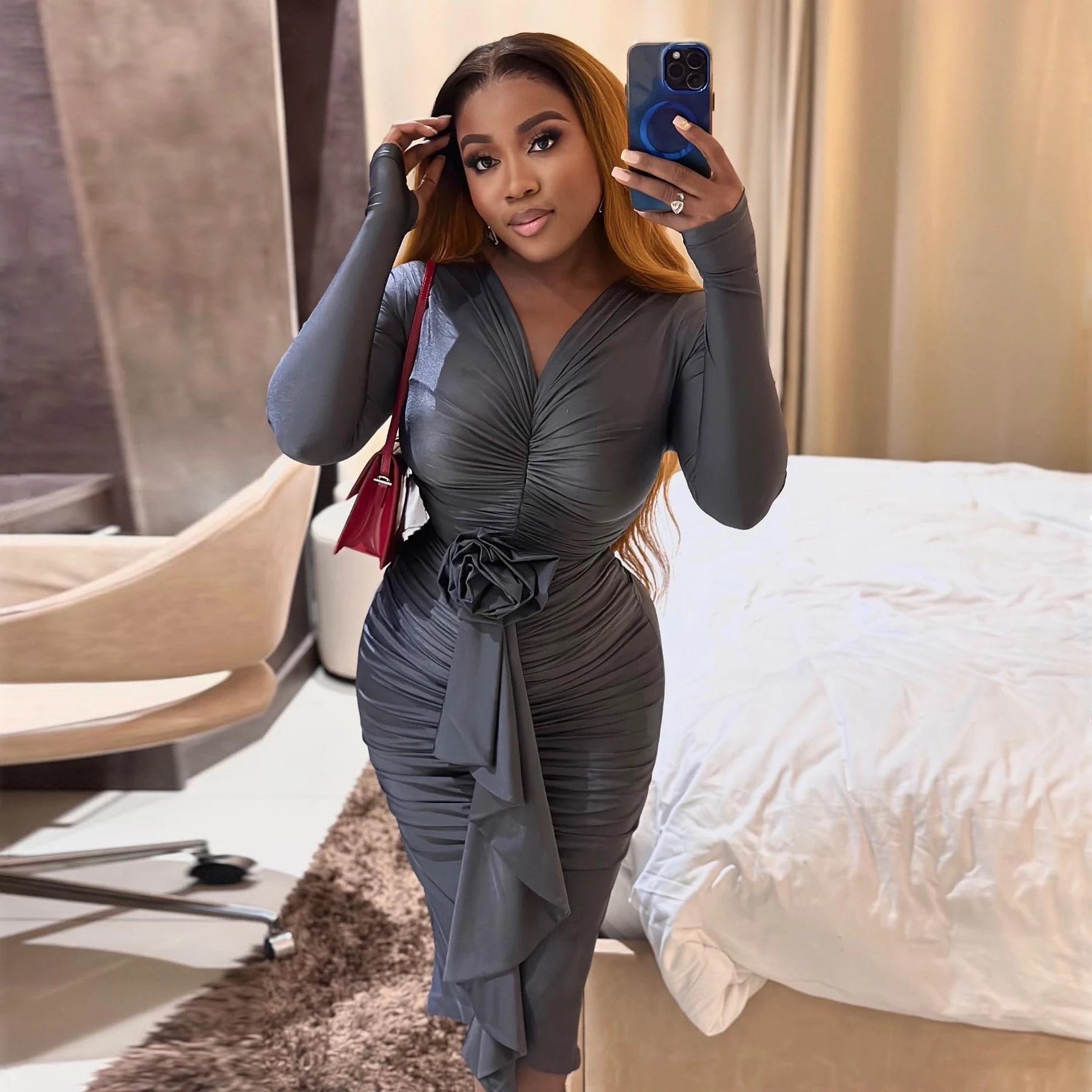 Elegant Gray Stretch Taffeta Midi Prom Dresses Sexy Sheath Pleated Tea Length Formal Occasion Dress Black Girls Evening Gowns