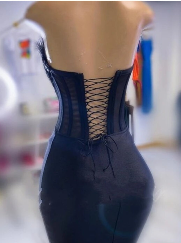 Elegant Strapless Long Prom Dress For Black Girls Beaded Crystal Birthday Party Dresses Feathers Evening Gowns Mermaid Lace