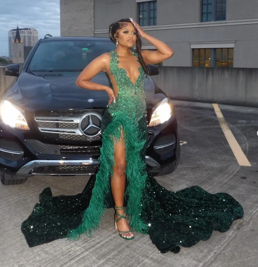 Emerald Green Sparkly African Prom Dresses for Women Luxury Diamond Crystal Feather Slit Evening Birthday Gala Gown Black Girl