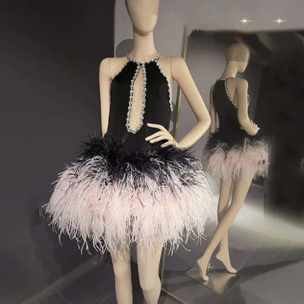 Fashion Black Women Mini Maxi Dresses With Multi Colored Feather Crystal A-line Short Dress To Holiday Birthday Party