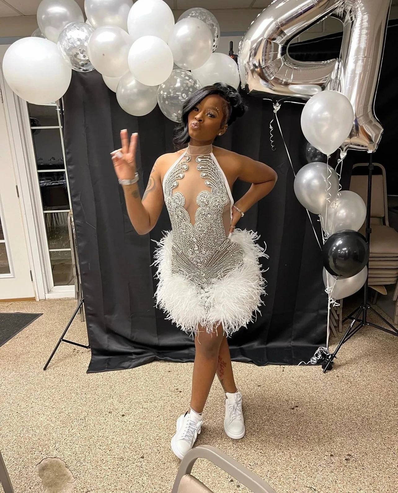 Feather Sexy See Through Short Black Girl Prom Dresses Beaded African Cocktail Dresses Women Party Gowns Birthday Homecoming