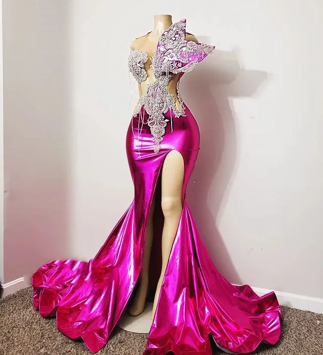 Fuchsia Aso Ebi African Evening Dresses Mermaid Sheer Appliques Beaded Slit Long Ghana Nigeria Black Girls Evening Gown Prom