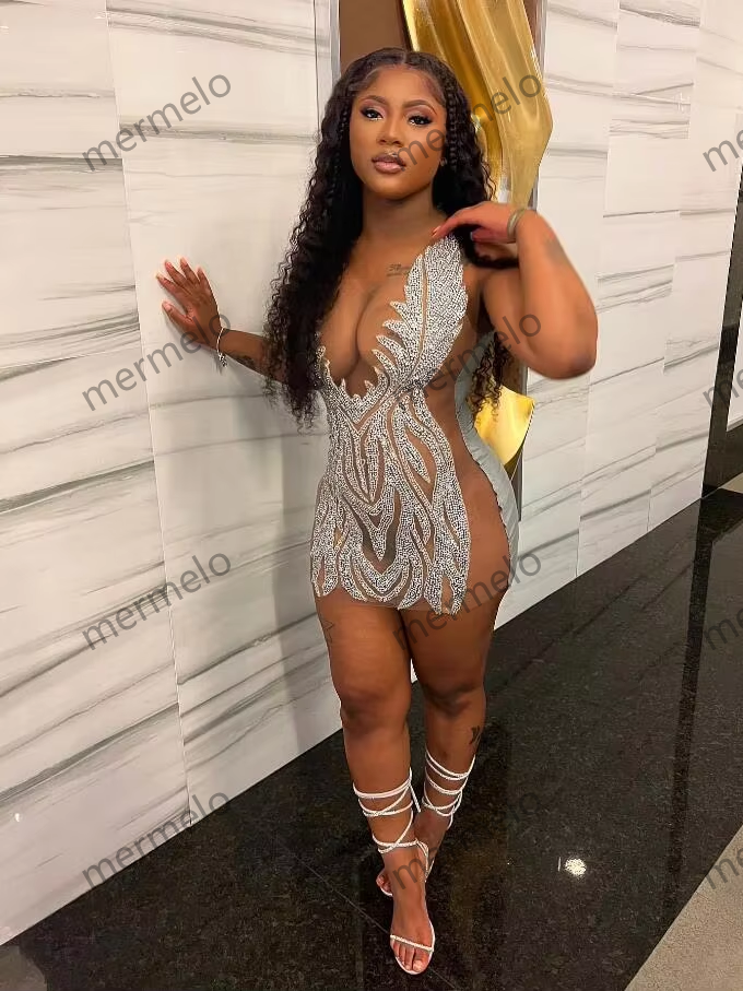 Gillter Sparkly Sheer Mesh Black Girl Evening Cocktail Gown silver beaded crystal