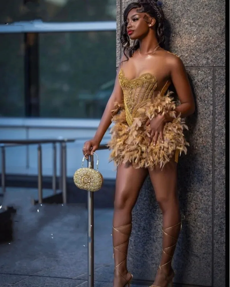 Luxury Feathers Birthday Dresses For Black Girl Beading Sequin Short Prom Party Gowns Sheer Neck Clubbing Dress Nightclub