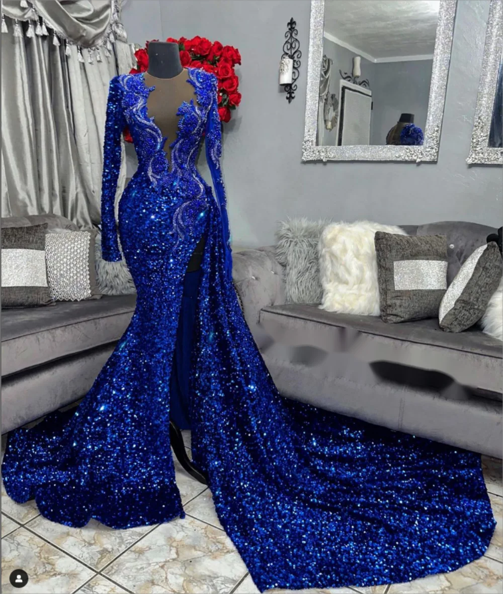 Glitter Royal Blue Mermaid Ball Gown Luxury Long Sleeve African Women Ball Gown Wedding