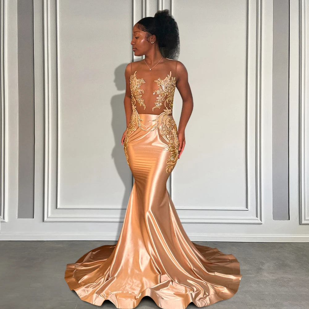 Gold Sheer O Neck Long Mermaid Prom Dresses Black Girl 2025 Sparkly Crystal Beads Elegant Satin Birthday Luxury Dress Customized