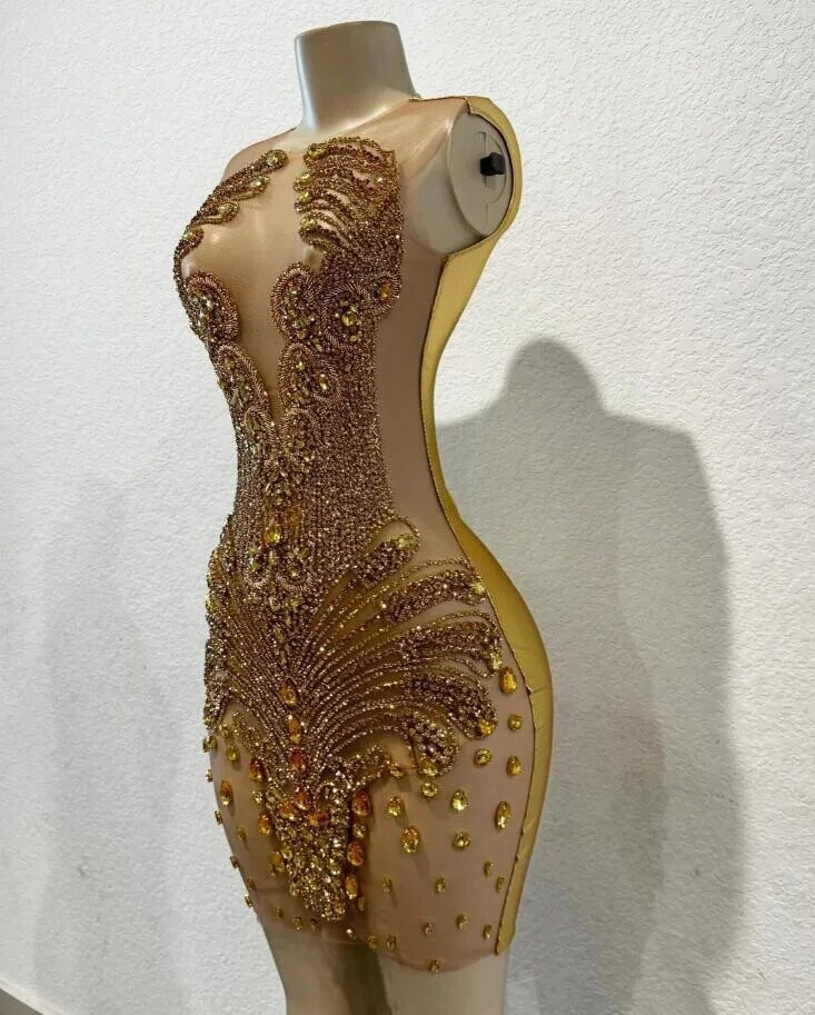 Gold Short Evening Reception Dress for Women Sparkly Diamond Crystal See Through Birthday Gown vestidos de fiesta para mujer