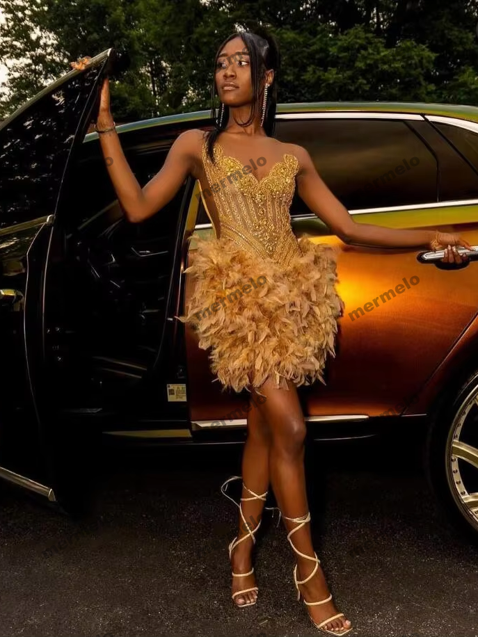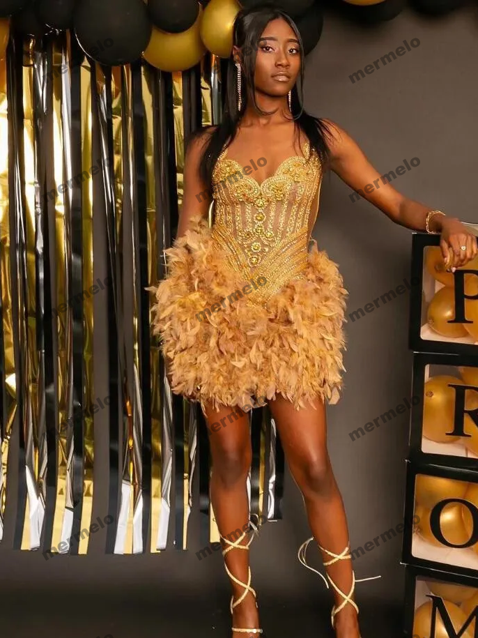 Gold Sparkly Short Prom Homecoming Dresses for Black Girl Luxury Diamond Crystal Feather Birthday gala cocktail gown