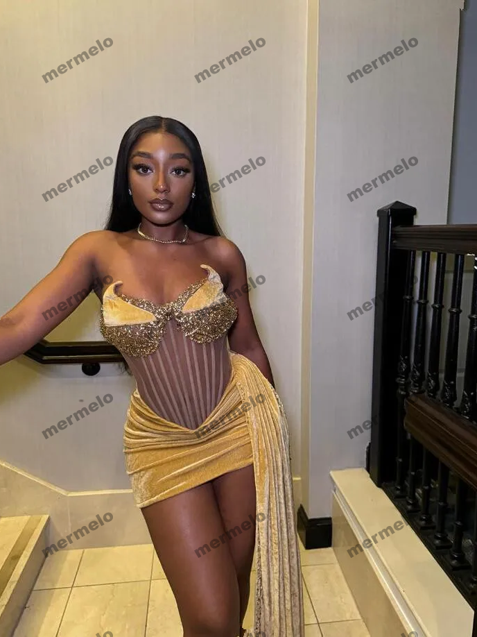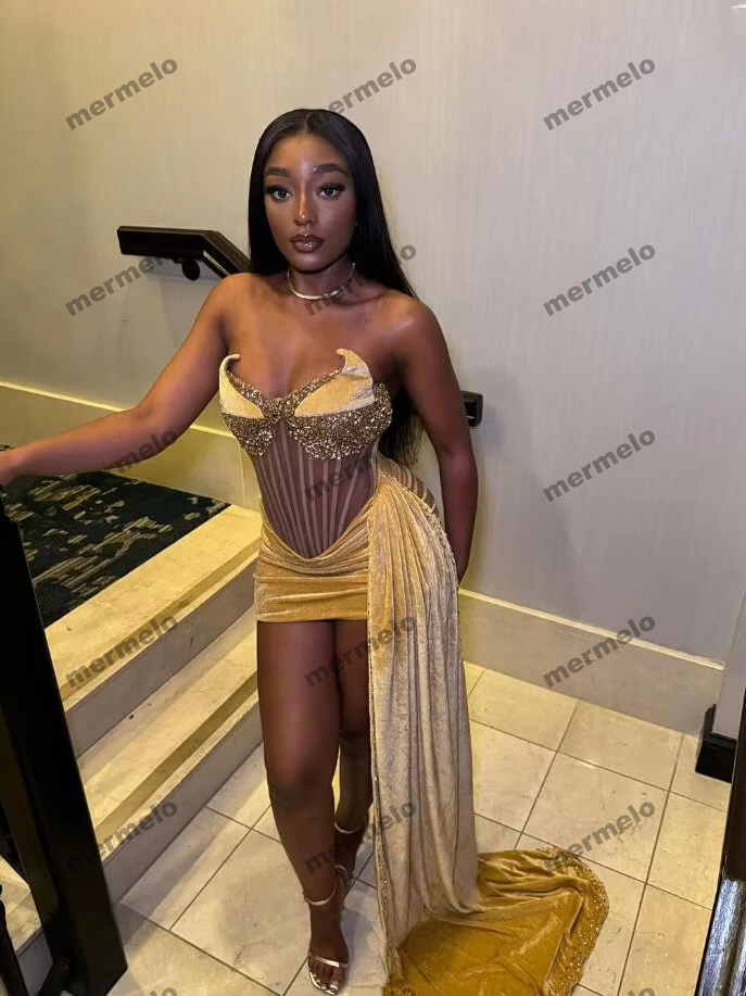 Gold Mini Evening Cocktail Dresses with Side Train Sparkly Crystal Sweetheart