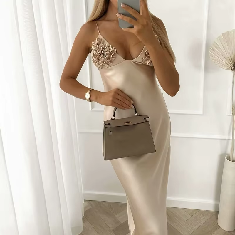 Hight Waist Layered Long Dress Sexy Sleeveless Solid Satin Party Dress Lady Elegant Floral V-neck Spaghetti Straps Dress