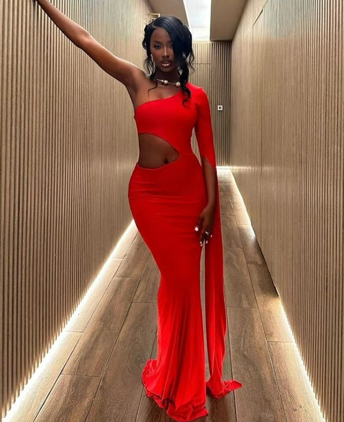 Hollow Dress Women Elegant One Shoulder Long Sleeve Solid Birthday Party Summer Trend Irregular Clubwear Maxi Bodycon